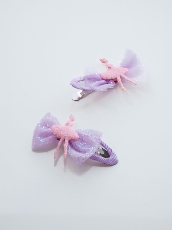 Små, charmerende hårspænder i lilla og rosa med motiv af balletdanser i tutu. Måler 4,8 cm. Farven kan variere en smule på både tutu og den glitrende ballerina