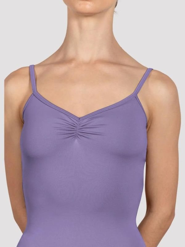 Bloch Arianne balletdragt i en flot lavendel farve med tynde stropper og rynke effekt foran og bagpå