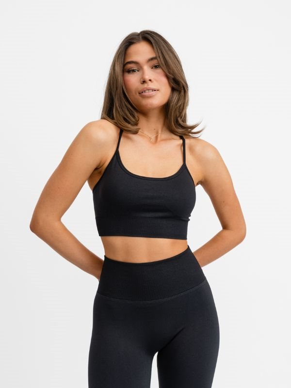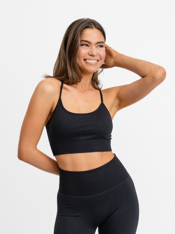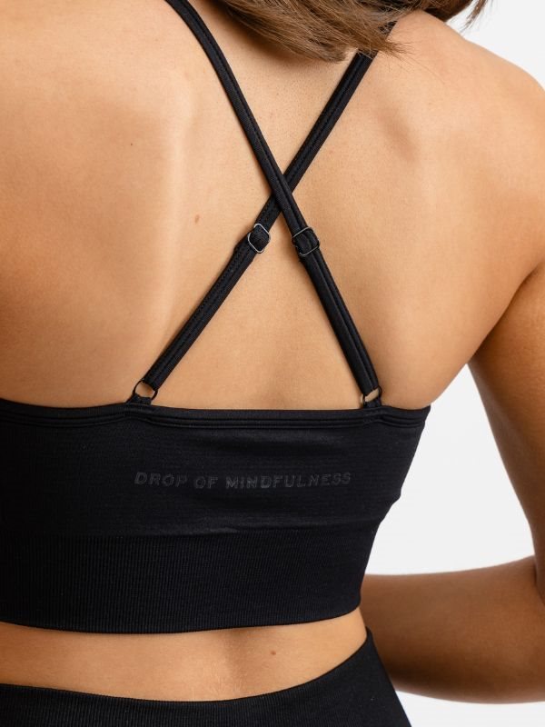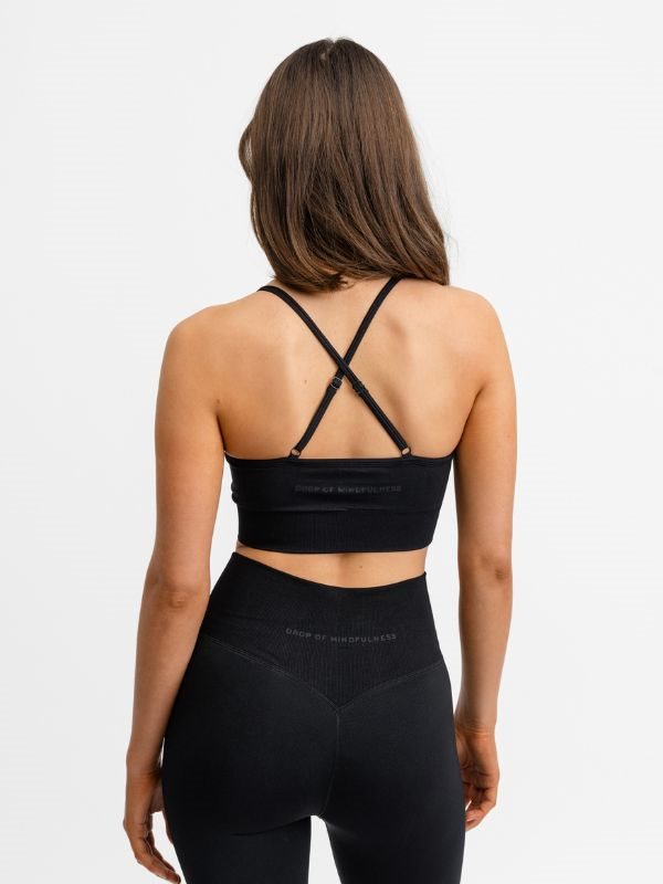 Signature seamless sort sports bh fra Drop of mindfulness er meget blød og behagelig med justerbare stropper, der krydser ryggen. Drop of mindfulness ton i ton logo på ryggen. Sports-bh'en har aftagelige puder og rib under brystet for bedre støtte, så du kan føle dig godt tilpas til alle former for træning. Puderne der let kan tages ud. Normal i størrelsen, men anbefalingen er, at du går en størrelse ned, hvis du ligger mellem to størrelser. Ved produktion af denne sømløse top tænkes der på miljøet, da rundstrik minimerer produktionsspild.
