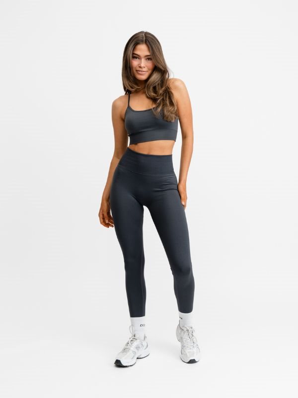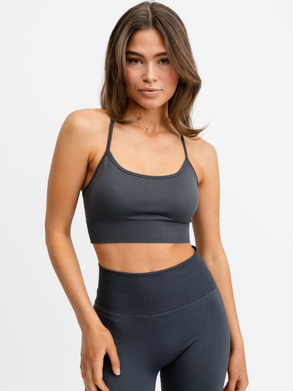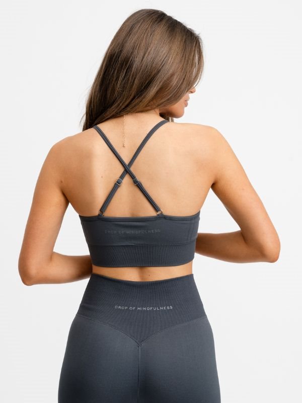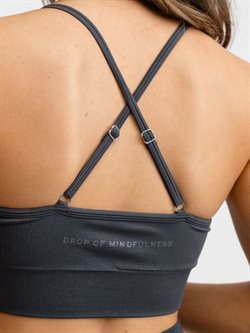 Signature seamless iron grey sports bh fra Drop of mindfulness er meget blød og behagelig med justerbare stropper, der krydser ryggen. Drop of mindfulness ton i ton logo på ryggen. Sports-bh'en har aftagelige puder og rib under brystet for bedre støtte, så du kan føle dig godt tilpas til alle former for træning. Puderne der let kan tages ud. Normal i størrelsen, men anbefalingen er, at du går en størrelse ned, hvis du ligger mellem to størrelser. Ved produktion af denne sømløse top tænkes der på miljøet, da rundstrik minimerer produktionsspild.