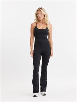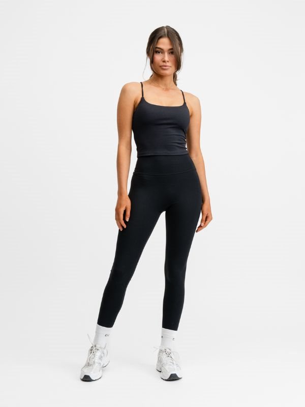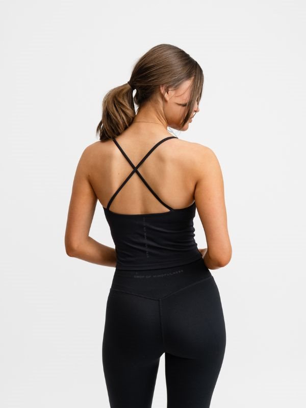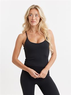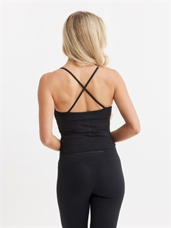 Denne elegante sorte top er fremstillet i et silkeblødt materiale, der føles fantastisk mod huden, og er designet med både stil og velvære i tankerne. Det bløde og feminine udtryk komplimenteres af en dyb, afrundet udskæring og en åben ryg med fine, tynde stropper, der tilsammen skaber en forførende og stilfuld silhuet.