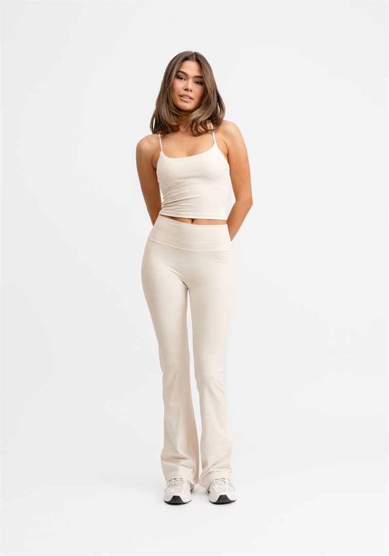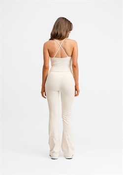 Denne elegante cremefarvet top er fremstillet i et silkeblødt materiale, der føles fantastisk mod huden, og er designet med både stil og velvære i tankerne. Det bløde og feminine udtryk komplimenteres af en dyb, afrundet udskæring og en åben ryg med fine, tynde stropper, der tilsammen skaber en forførende og stilfuld silhuet.