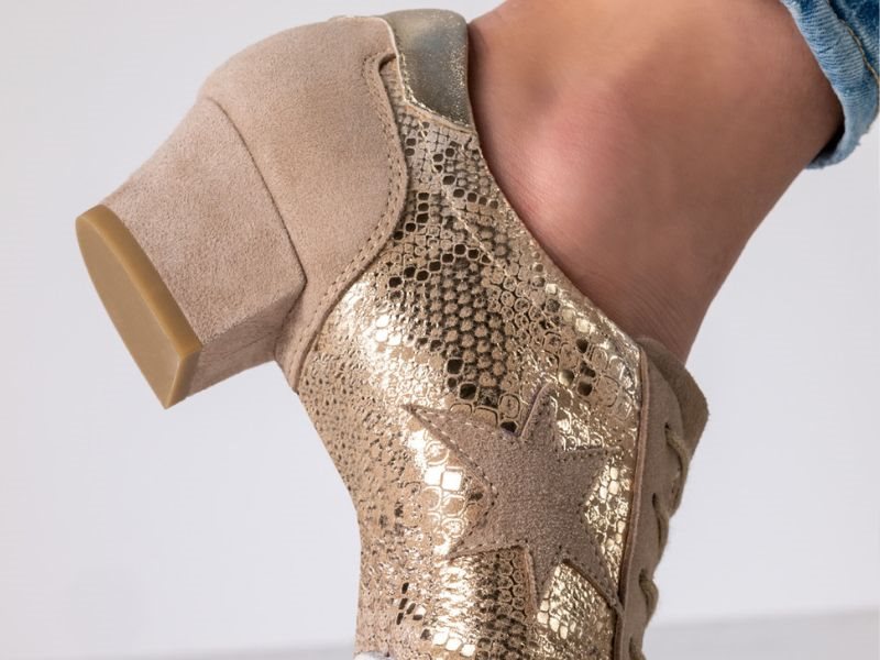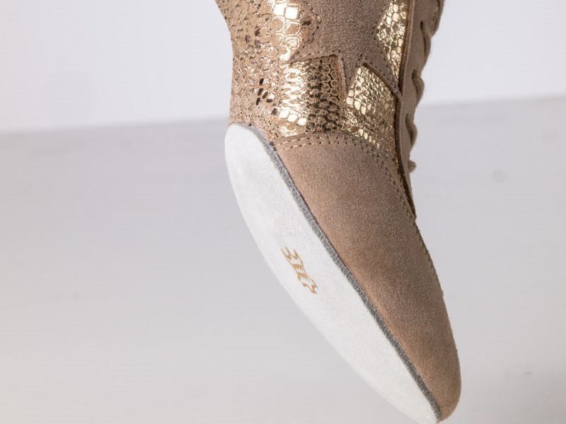 Højkvalitets beige ruskind kombineret med platinfarvet printet gedeskind, som smyger sig blødt om foden. Åndbart og fugtabsorberende læderfor, der giver høj komfort under dans.