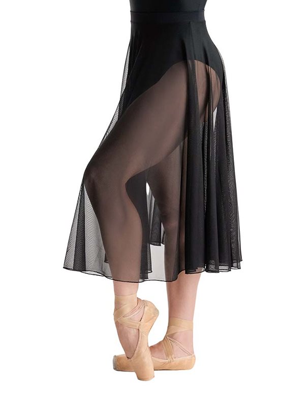 Sort lang balletskørt i stretch mesh med elastik i taljen med 3 cm bred elastik. Balletrosa ton i ton logo øverst bagpå skørtet.