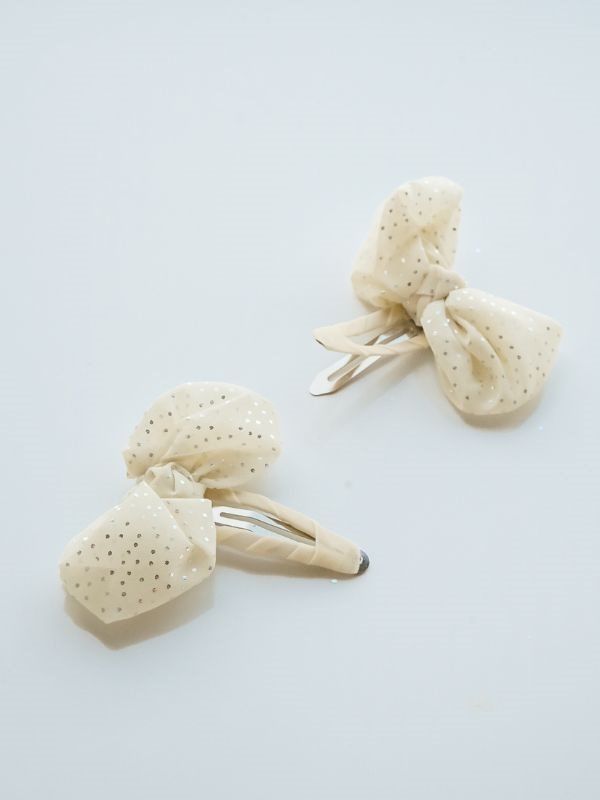 Små søde charmerende hårclips i cremefarvet chiffon, dekoreret med elegante sølv prikker. Perfekt til både hverdag og fest. Pakken indeholder 2 stk. ballet-inspirerede hårspænder, der tilføjer et touch af finesse til ethvert look.