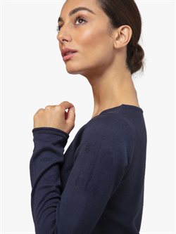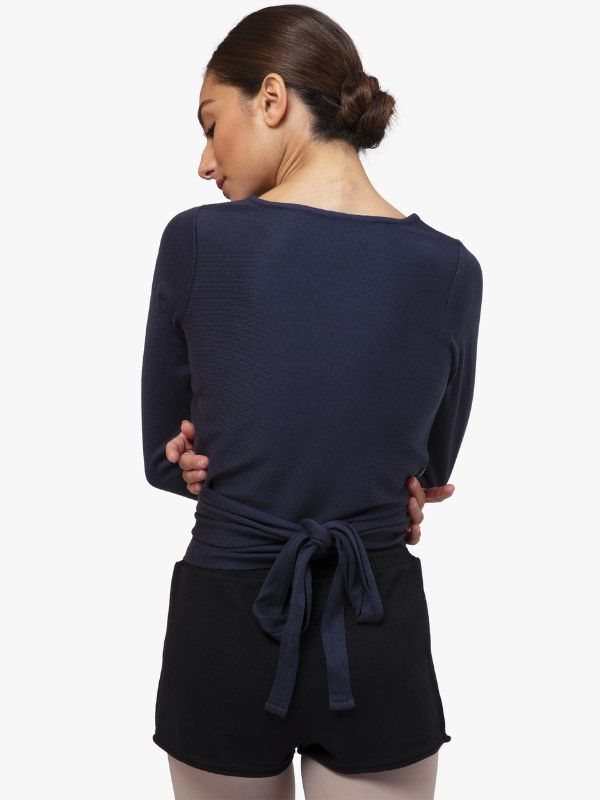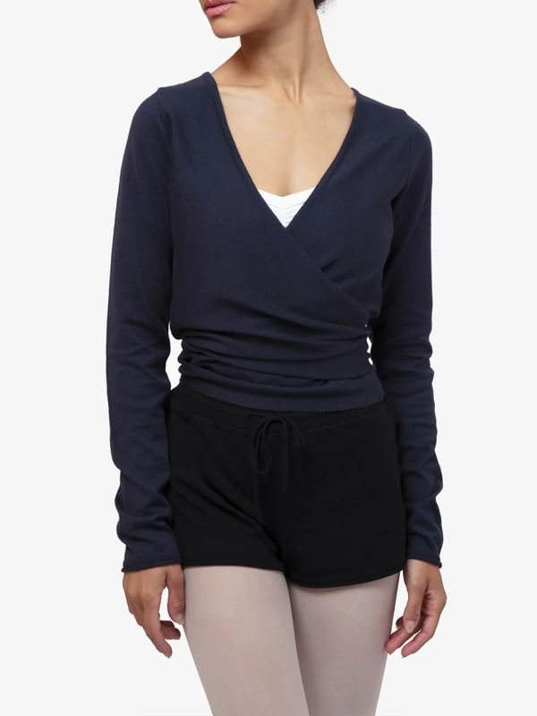 Mørkeblå danse slå om strik fra Repetto. Designet med en smuk V-udskæring og justerbart bindebånd i taljen, fremhæver denne strik din holdning og silhuet på en flatterende måde. Den lette og løse pasform sikrer maksimal komfort, gør den ideel til både afslappede og mere intense opvarmninger.