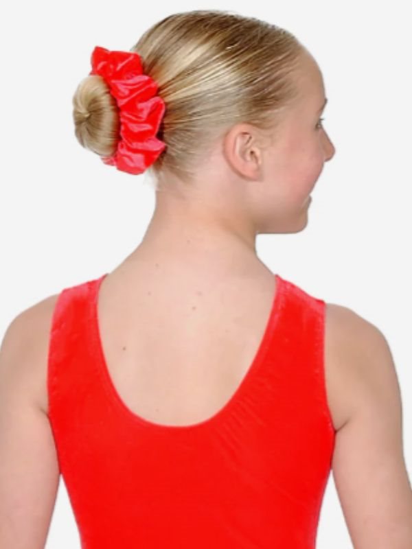 Rød velour scrunchie til gymnastik er et praktisk og stilfuldt tilbehør, der er designet specielt til aktiviteter som gymnastik. Holder håret på plads.