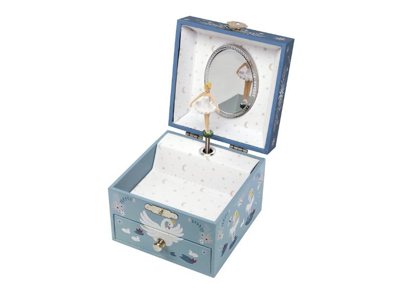 Smykkeskrin i blå med svane, ballerina og musik
