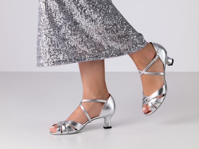 Bonnie dansesko i sølvskind til damer fra Werner Kern imponerer med feminin elegance og høj komfort. Danseskoen er fremstillet i smukt, let skinnende sølvfarvet nappa-læder og har en elegant fire-delt front, der smyger sig flot om foden. De krydsede stropper over vristen giver god støtte og fremhæver skoens elegante silhuet.