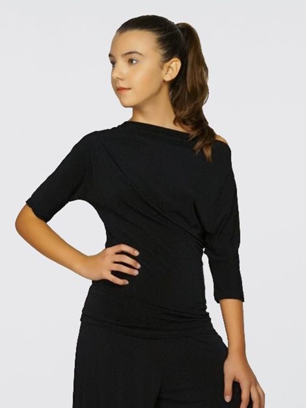 Sort bluse med bådhals og halvlange ærmer. Denne bluse er ideel til dans og hverdagsbrug, designet til både teenagere og voksne damer. Fatterende løs pasform og praktiske halvlange ærmer. 91% polyester og 9% elastan. Kombiner blusen med den sorte dansenederdel Malaga for et fuldendt og stilfuldt look.